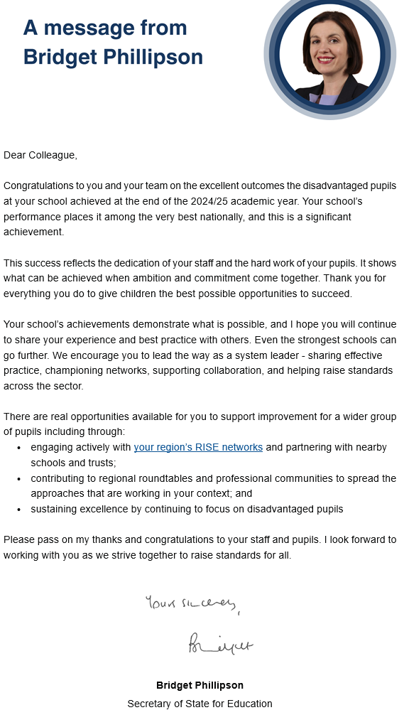 Letters were received on 27th January from the Secretary of State Bridget Phillipson and the Director General, Regions Group Tim Coulson congratulating the three schools for their significant achievements in helping disadvantaged children.